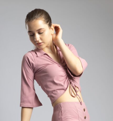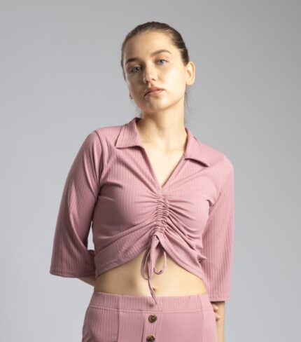 V-Neck Half Sleeve Top with Front Drawstring Pink