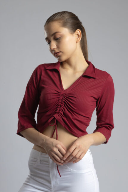 V-Neck Half Sleeve Top with Front Drawstring Maroon