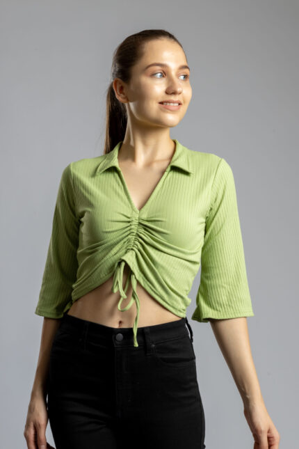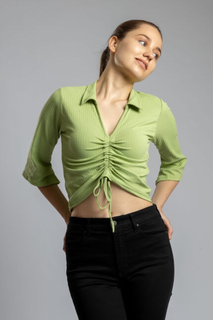 V-Neck Half Sleeve Top with Front Drawstring Olive