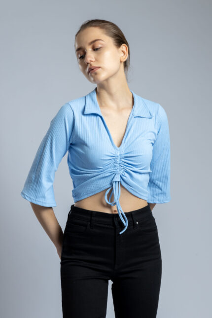 V-Neck Half Sleeve Top with Front Drawstring Sky Blue