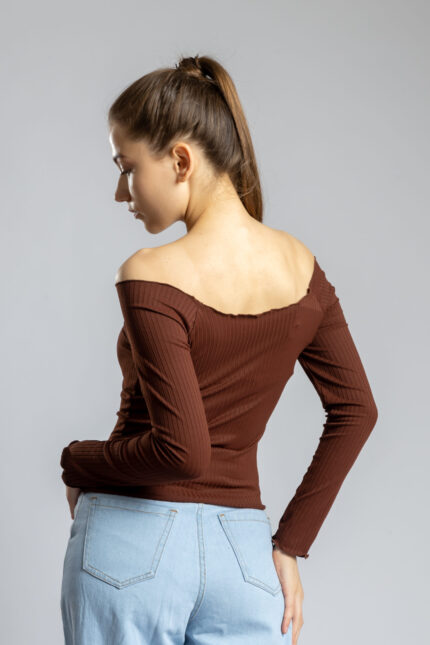 Off-Shoulder Full Sleeve Babylock Top for Women Choco Brown